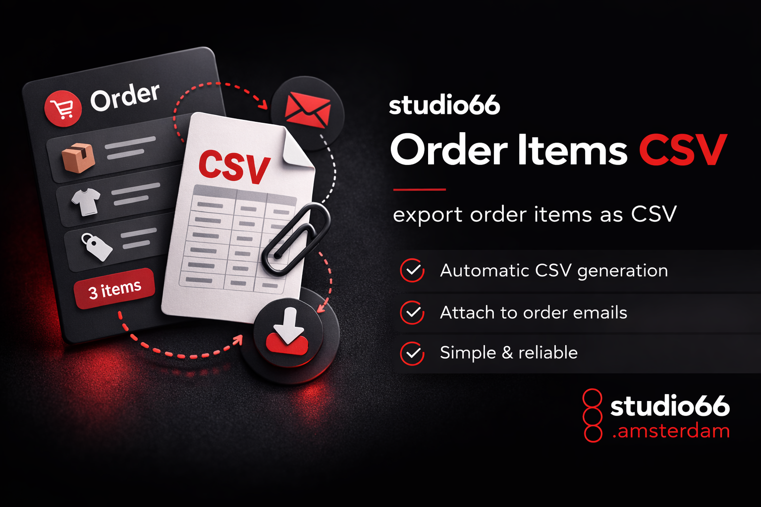 studio66 Order Items CSV for WooCommerce automatically attaches a CSV file with order line item details to selected WooCommerce order emails. Works immediately after activation — no license key or account required.